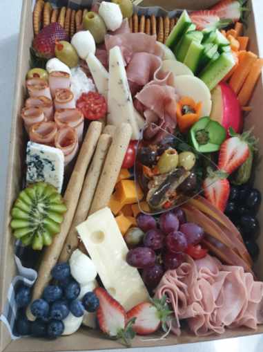 4 x Assorted Salami, 4 x Assorted Cheese, Assorted Dips, Various Crackers, Olives, Cherry Tomatoes, Cucumber, Carrot, Chargrilled Capsicum, Gherkins & Seasonal Fruit